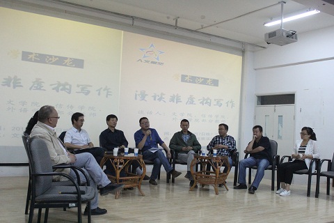 漫谈围绕非虚构写作展开,会场气氛轻松有序,与会老师根据各自的专业特点谈了对非虚构的认识,非虚构写作研究的内容以及非虚构写作研究对学科的助推。王明博老师介绍了公司成立“中国非虚构写作研究中心”的过程,以及中心成立后的运行方式;吕玉铭老师分享了他教授“非虚构写作”课程的体会,同学们对非虚构写作的兴趣和写作过程中的感人片段;哈建军老师从他研究杨显惠系列作品的经验谈了非虚构写作研究在学术上的前沿性;李建宗老师从人类学的角度谈了对非虚构写作中注意的几个问题;王锐老师从虚构与非虚构的比较中探讨了非虚构写作的本质因素;傅彤老师从电影学的角度谈非虚构在电影史上的发展过程;李春霞老师介绍了国外非虚构写作的现状。漫谈过程中同学们和老师互动热烈,同学们对非虚构写作有了更深入的认识。