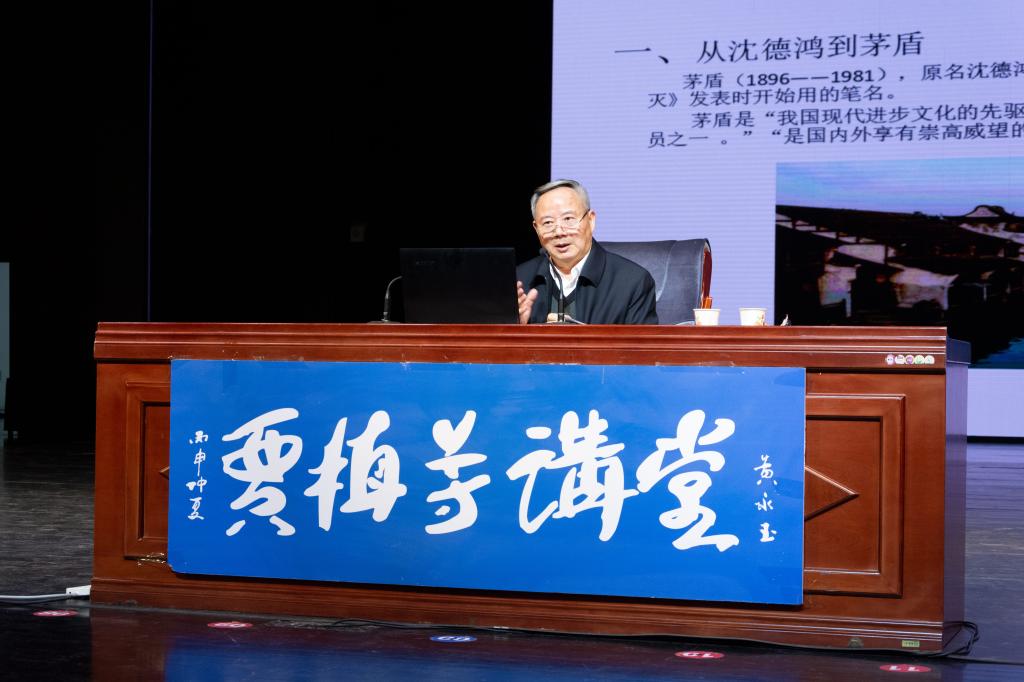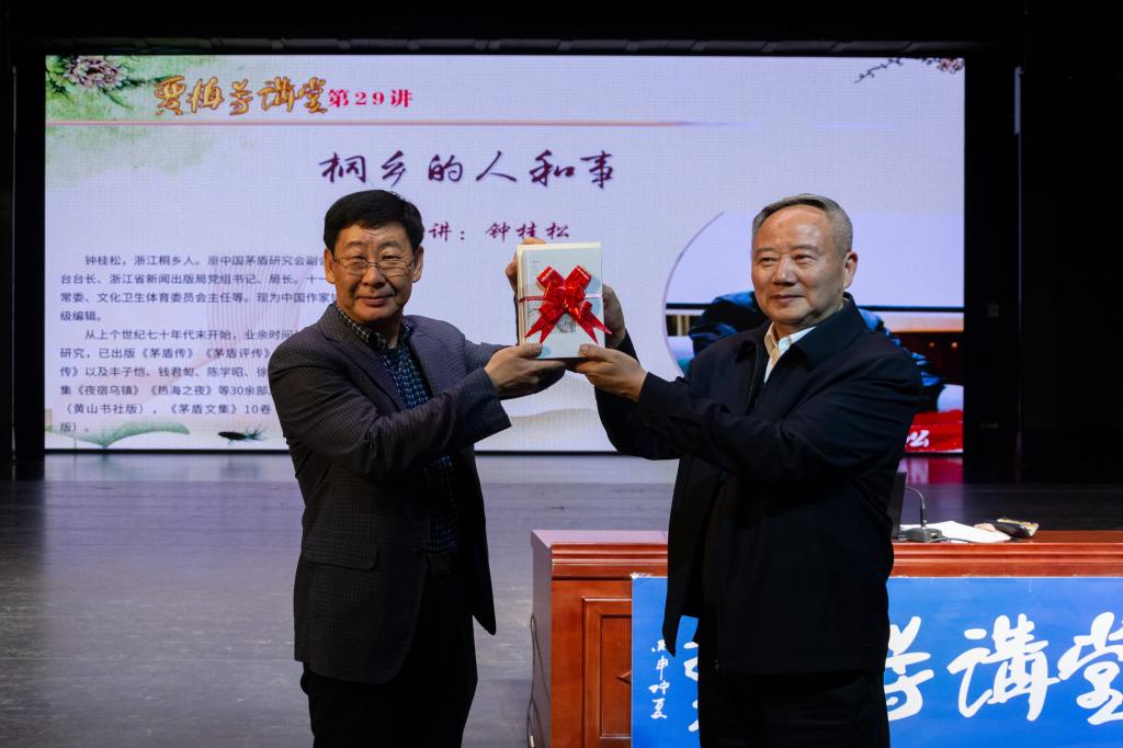 在演讲中钟桂松先生讲述了五位成长于浙江桐乡的文化名人的故事。他们是茅盾先生、沈泽明先生、丰子恺先生、钱军匋先生和张琴秋女士。演讲以大量的史料再现了五位先贤在革命历史洪流中坚定的革命理想、高尚的情怀、坚韧吃苦的奋斗精神以及在不同领域做出的卓越贡献。演讲事例鲜活,图文并茂,趣味盎然,会场听众凝神静气,仔细咀嚼,回味悠远。钟桂松先生的演讲不仅是一堂生动的文学课,更是一堂别开生面的大思政课。