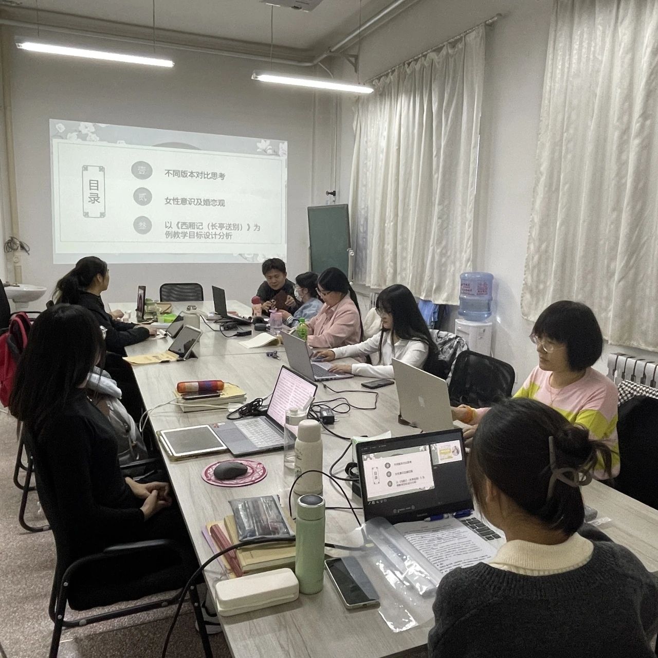 在讨论环节,围绕《西厢记(长亭送别)》这篇文章的教学目标设计与戏曲相关名著的阅读方法话题展开了讨论。根据新课程标准的 “学科核心素养“的要求,对这篇文章进行教学目标分析,重点对曲词和手法的进行赏析,对文章内容详细的解读。戏曲名著阅读的问题,同学们都提出自己在阅读过程中产生的困惑不解,阅读难、兴趣不高、读不懂等一些问题。