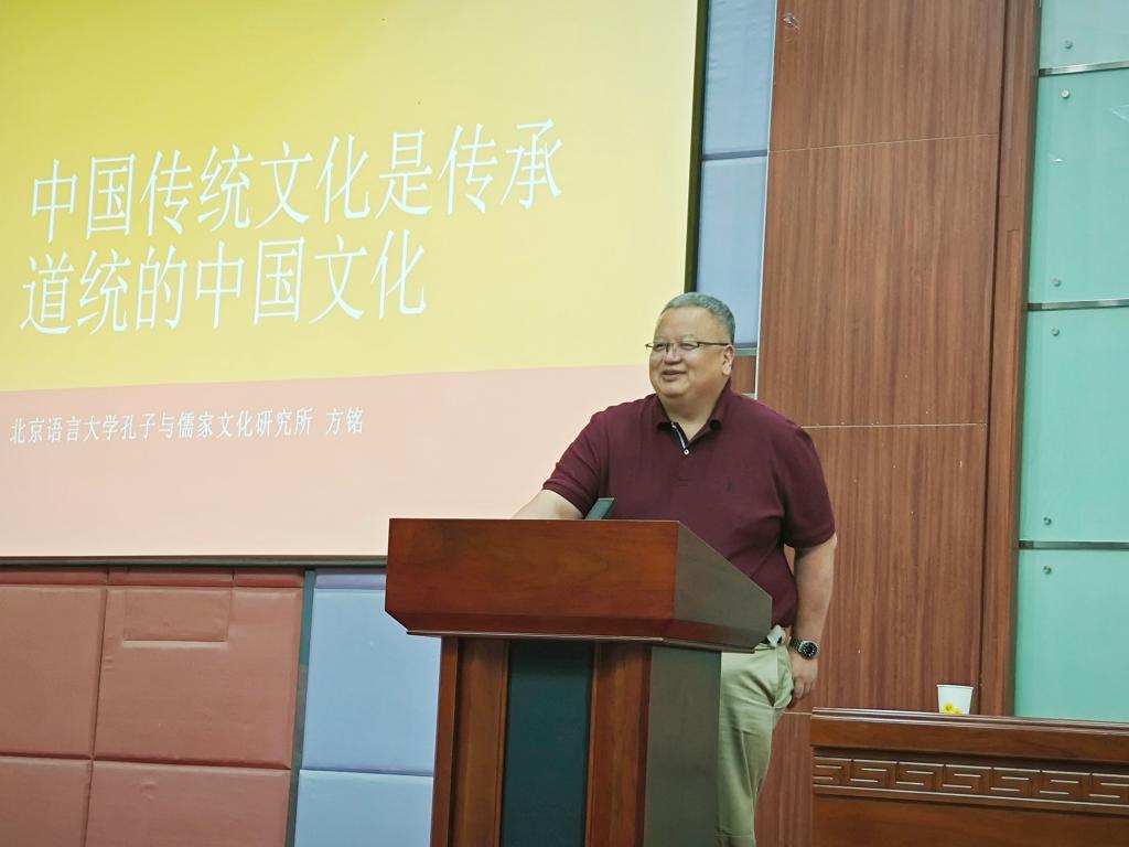 讲座伊始,方铭教授辨析梳理了“中国文化”与“中国传统文化”概念,引出“中国传统文化是传承道统的中国文化”的话题。他围绕儒家典籍的相关记载,介绍了中国传统文化的一个中心,三个基本点,即以孔子所倡导的“天下为公”为中心,以忠恕、均平、仁惠为基本点,忠恕是人的基本出发点,均平是社会基本目标,仁惠是国家利益的根本。之后。方铭教授介绍了中国传统文化的五大观念:爱人为本、天下情怀、士人责任、坚守底线、一心向善;以及中国传统文化的五要素:主体性、传承性、普遍性、世界性、永恒性。