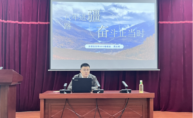 周元明以“八年进疆路,奋斗正当时”为题,向在座的师生们讲述了自己从校园到职场,在新疆这片热土上的奋斗故事。回忆了八年前响应号召,怀揣梦想一路向西,开启自己在新疆的职业生涯。并解读了新疆就业现状和未来的发展趋势,鼓励学弟、学妹们勇于探索未知领域,敢于挑战自我。