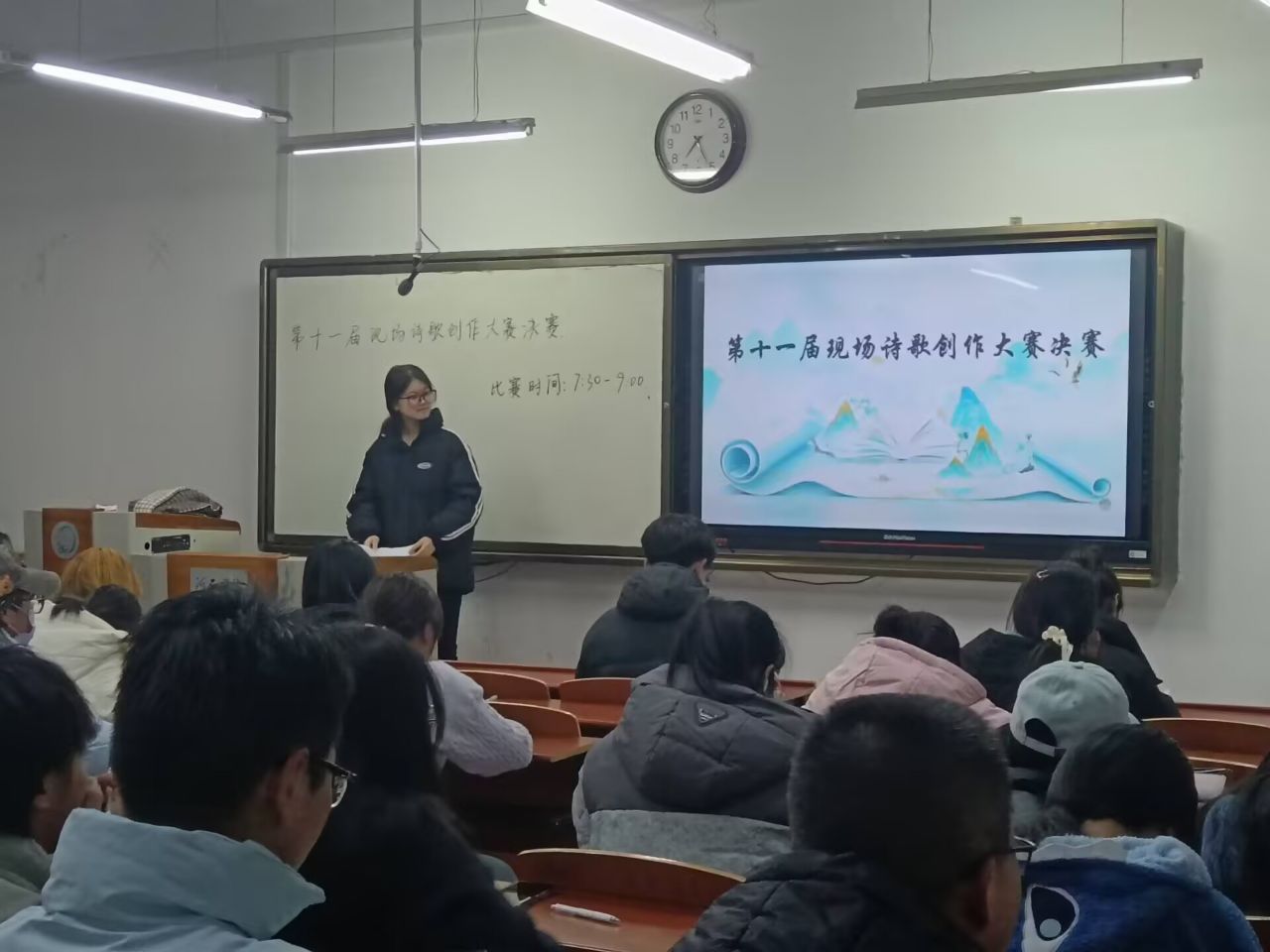 决赛于11月24日晚上7点在8号教学楼102教室举行,现场气氛紧张而热烈。参赛选手们围绕“新韵古风,时代诗声”的主题,展开了一场精彩的诗歌创作比拼。他们或挥毫泼墨,或低头沉思,用优美的文字和独特的视角,将传统古风与现代元素巧妙结合,创作出一首首充满韵味与时代感的诗歌作品。