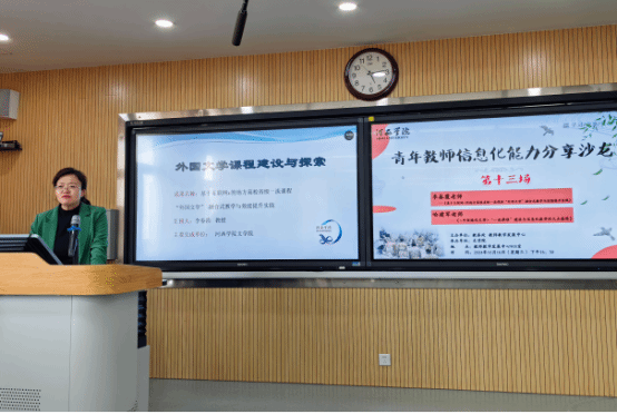 李春霞以《基于互联网+的地方高校省级一流课程“外国文学”融合式教学与效能提升实践》为题。从最初从事信息化课程建设所面临的困境切入,分享了利用优质开放课程资源、雨课堂、腾讯会议、钉钉群、微信公众号等多种信息化手段开展课程建设和改革的具体实践及所得成果,为老师们提供了借鉴和参考。