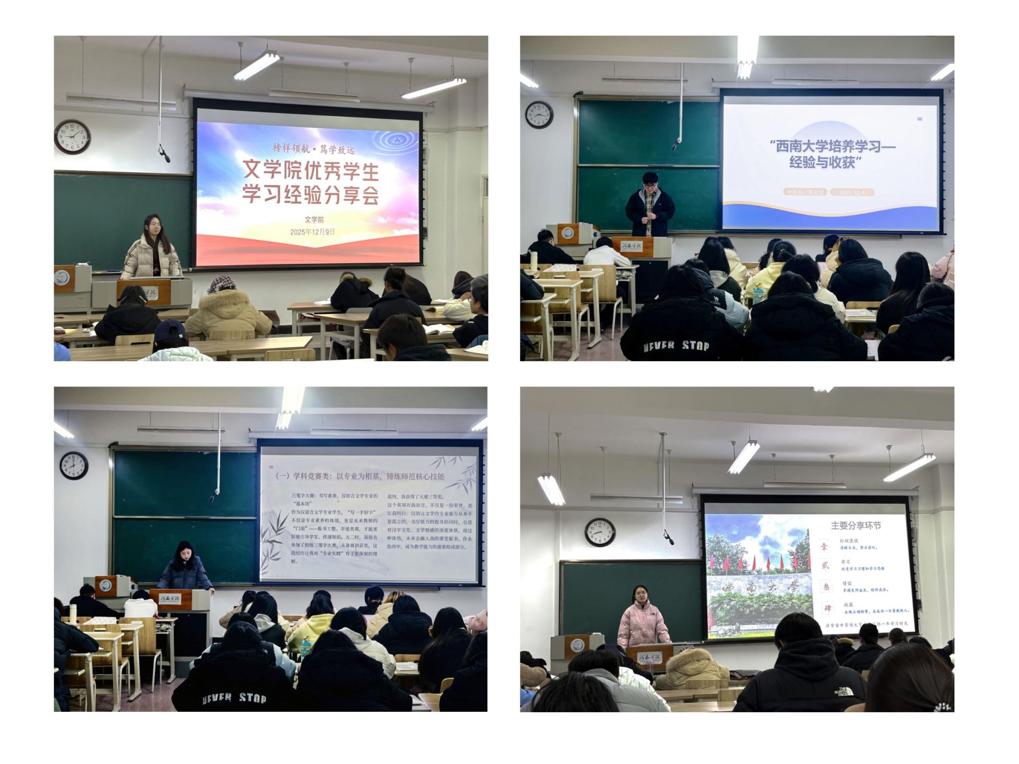 近日,公司组织优秀员工代表走进25级各班,开展学习经验分享报告会,为新生答疑解惑、指引方向。本次活动邀请3名国家奖学金获得者和2名西南大学联合培养返校学子担任主讲人。国奖获得者结合自身经历,围绕四六级备考、第二课堂实践、专业课学习等新生关切问题,倾囊相授实用技巧;联合培养学子分享跨校求学的探索历程与成长感悟,助力新生明晰学业规划。活动现场互动频繁、氛围热烈,新生们认真聆听记录、积极提问交流,纷纷表示收获满满。...