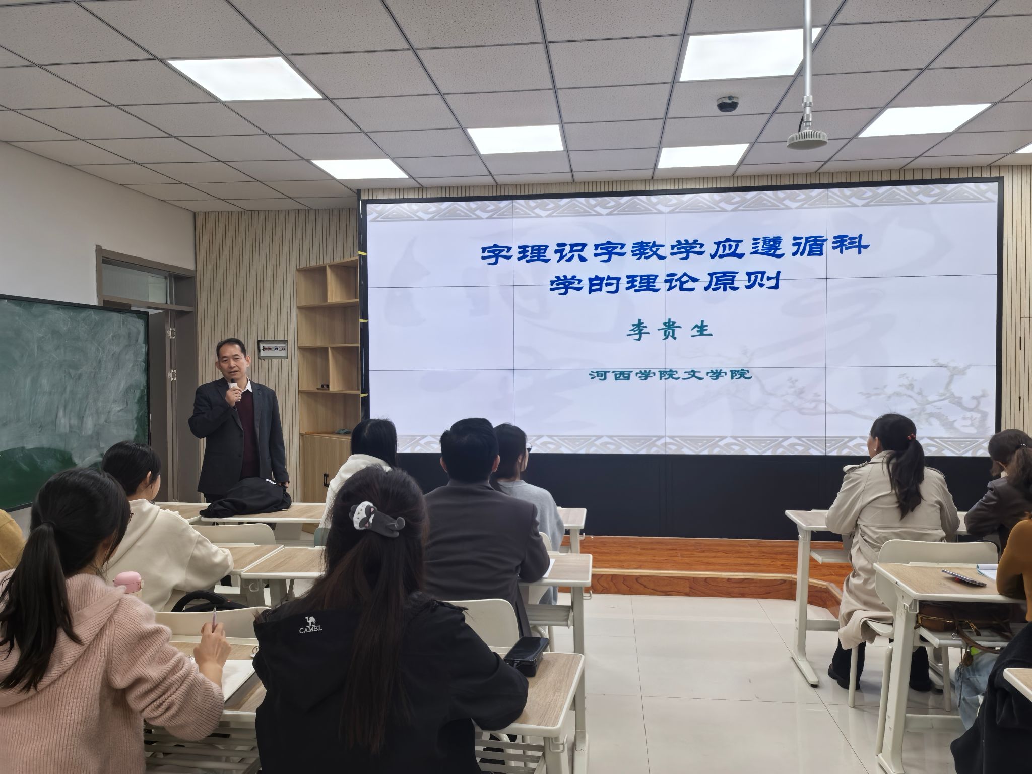2025年10月23日下午4:30,公司“人文星空”系列学术讲座在十教316隆重举行。本次讲座特邀公司资深教授、汉字文化与教学研究专家李贵生教授,以“字理识字教学要遵循科学的理论原则”为主题,为在场师生带来了一场兼具学术深度与实践指导意义的精彩报告。公司师生百余人齐聚一堂,共同聆听这场思想盛宴。李贵生教授以“六书”理论、汉字构形学理论为切入点,指出字理识字教学就是用“六书”理论、汉字构形学理论指导识字教学,分析汉字的造字理据,...