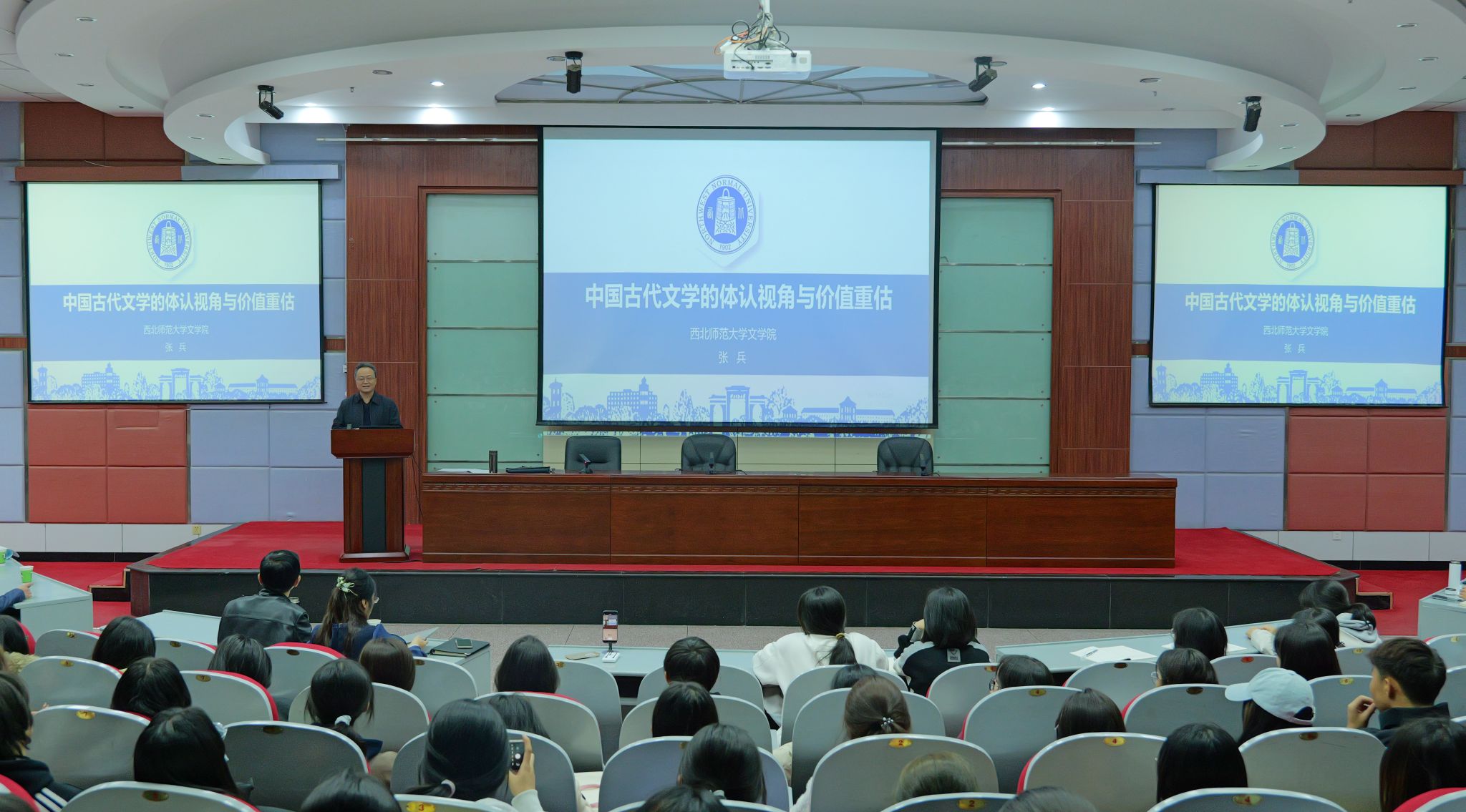 10月16日下午19:30,beat365在线官网入口特邀西北师范大学beat365在线官网入口博士生导师张兵教授,在图书馆二楼报告厅作题为“中国古代文学的体认视角与价值重估”的学术报告。beat365在线官网入口二百余名师生到场聆听,共探中国古代文学研究的新路径。张兵教授为文学博士,博士生导师,在《文学遗产》《文学评论》《新华文摘》等权威刊物发表学术论文180余篇,出版《文化视域中的清代文学研究》等学术著作9部,主编、参编《中国西行文献丛书》等10余部,主持国家社科基金重点项目《...