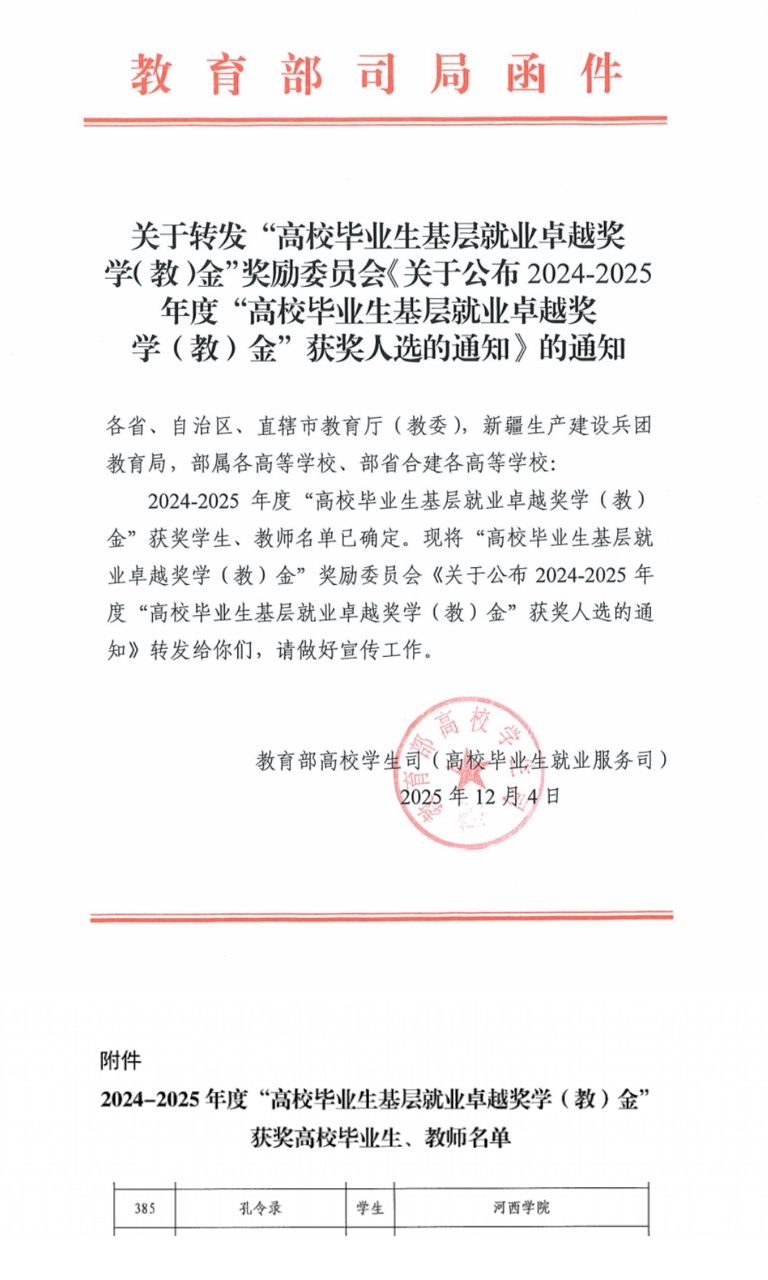 公司员工孔令录荣获 2024-2025年度“高校毕业生基层就业卓越奖学金”
