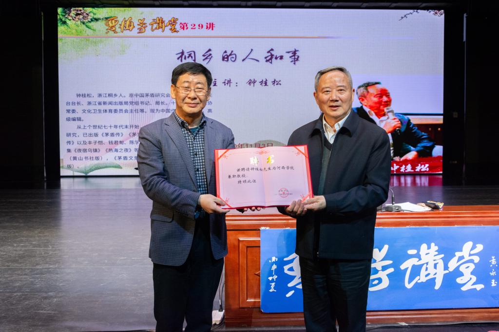 11月3日晚,原浙江电视台台长、中国茅盾研究会副会长、著名学者钟桂松先生应邀在贾植芳讲堂作了题为“桐乡的人和事”的演讲。演讲由贾植芳讲堂特邀主持人李辉主持。公司师生约500余人聆听了报告。演讲前,董事长张汉燚教授接受了钟桂松先生的赠书,并为他颁发了兼职教授聘书。在演讲中钟桂松先生讲述了五位成长于浙江桐乡的文化名人的故事。他们是茅盾先生、沈泽明先生、丰子恺先生、钱军匋先生和张琴秋女士。演讲以大量的史料再...